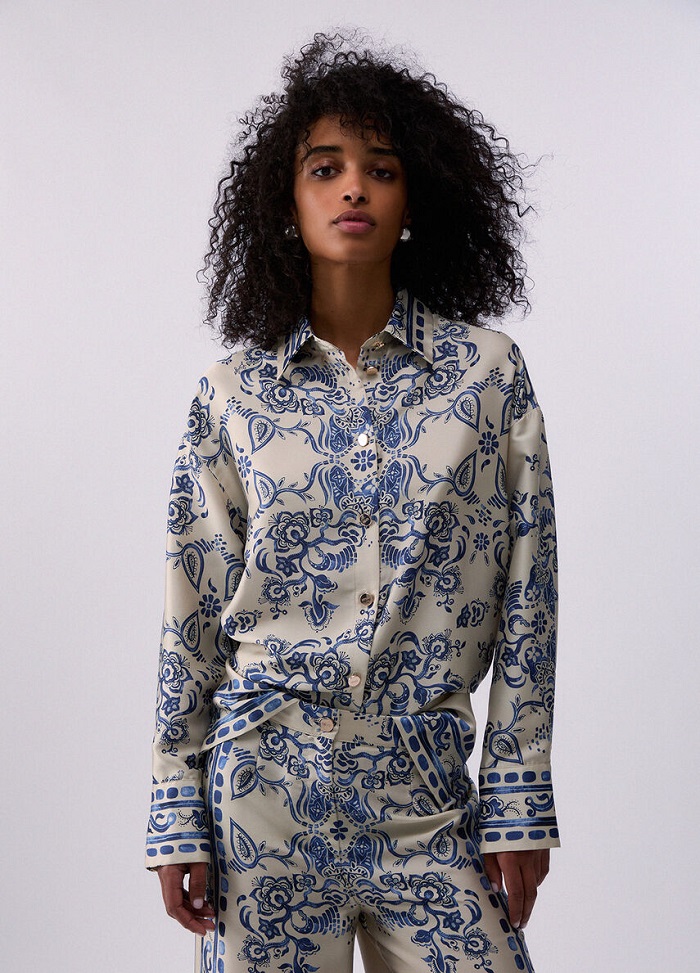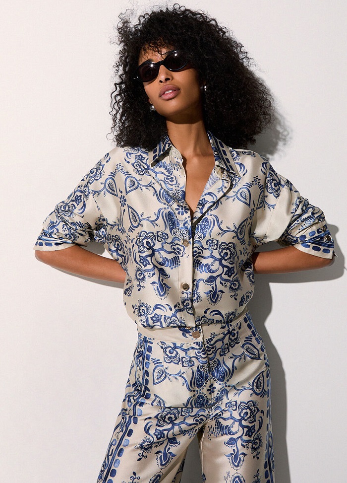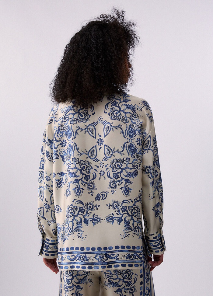 Elegantná dámska košeľa, ktorá okamžite zaujme svojím originálnym vzorom v modro-béžovej kombinácii. Jemne lesklý materiál pôsobí luxusne a príjemne na dotyk, vďaka čomu je ideálnou voľbou na každodenné nosenie aj špeciálne príležitosti.