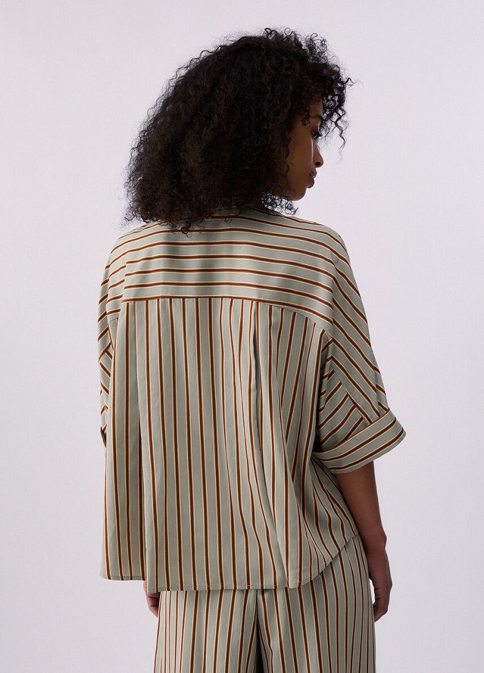 Moderná dámska košeľa s nadčasovým pruhovaným vzorom, ktorá je ideálnou voľbou pre štýlové a pohodlné outfity. Košeľa má voľnejší strih, ktorý zaručuje maximálne pohodlie počas celého dňa. Kratšie rukávy a klasický golier dodávajú modelu ležérno-elegantný vzhľad, zatiaľ čo zapínanie na gombíky podčiarkuje jeho univerzálnosť. Perfektne sa hodí k nohaviciam do kompletu, ale aj k džínsom či sukni pre vytvorenie štýlového každodenného outfitu. Skvelý kúsok pre ženy, ktoré preferujú jednoduchosť, pohodlie a moderný dizajn.