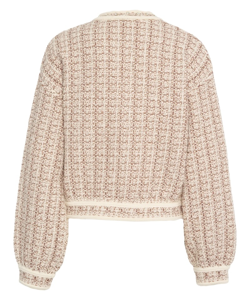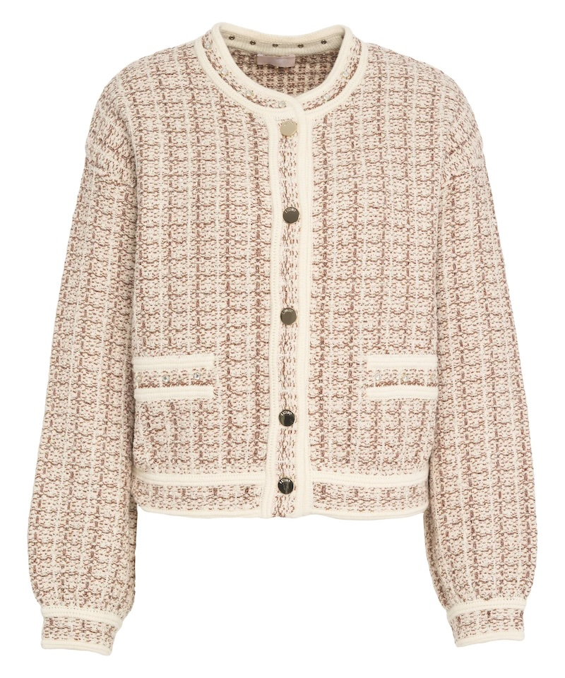 Elegantná dámska bunda Liu Jo v jemnom béžovom odtieni s ikonickým tweedovým vzhľadom. Tento model v štýle luxusného kardigánu vyniká precíznym spracovaním, dekoratívnym lemovaním a kovovými gombíkmi, ktoré dodávajú outfitu sofistikovaný charakter.