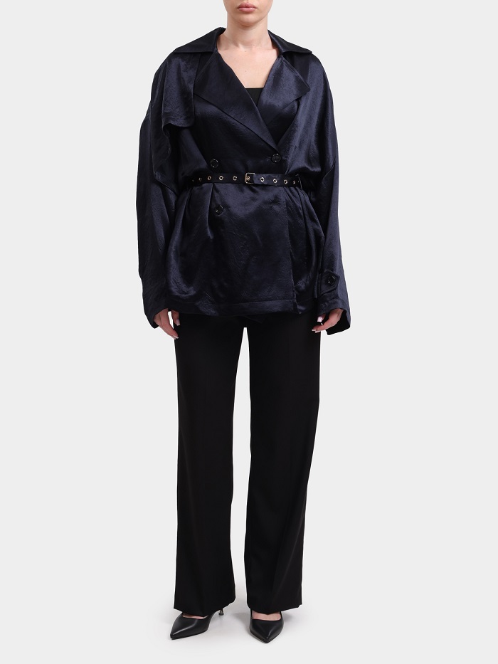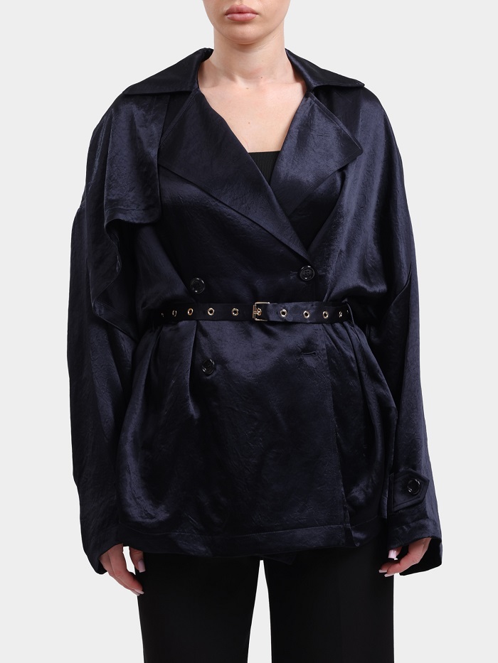 Štýlová dámska bunda, ktorá spája moderný dizajn s nadčasovou eleganciou. Jej voľnejší strih doplnený o opasok krásne zvýrazní pás a vytvorí ženskú siluetu, zatiaľ čo jemne lesklý materiál dodáva outfitu luxusný vzhľad.