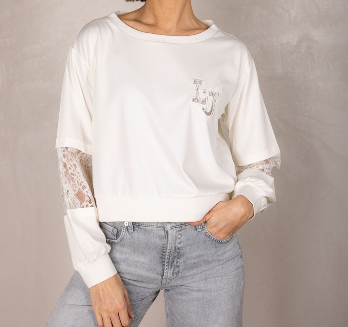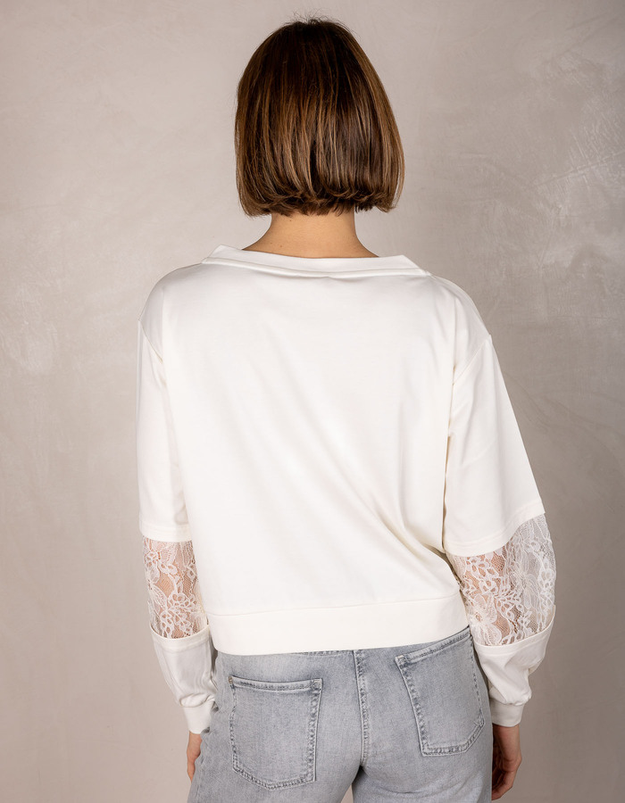 Elegantná dámska mikina v bielom odtieni, ktorá zaujme na prvý pohľad svojimi originálnymi detailmi. Kombinácia hladkého materiálu s čipkovanými rukávmi dodáva kúsku ženskosť a jedinečný štýl. Voľnejší strih zabezpečuje pohodlie pri nosení, zatiaľ čo jemné logo na hrudi pôsobí decentne a moderne.