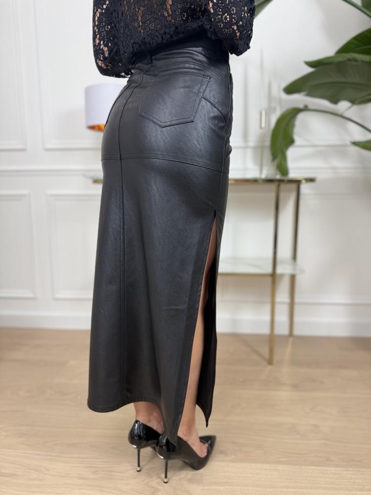 Elegantná koženková ukňa v midi dĺžke, ktorá spája ženskosť s moderným štýlom. Má vysoký pás, zapínanie na gombík a zips, klasické vrecká vpredu aj vzadu a rovný strih, ktorý krásne predlžuje postavu. Sukňa je vyrobená z mäkkého eko-koženého materiálu s jemným leskom, ktorý pôsobí luxusne, no zároveň je pohodlný na nosenie.