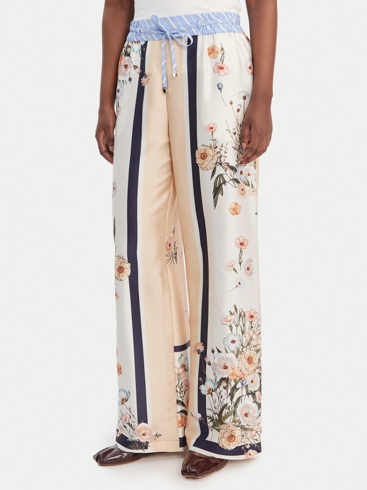 Štýlové dámske nohavice so širokými nohavicami a jemnou kvetinovou potlačou prinášajú dokonalú kombináciu pohodlia a elegancie. Ľahký, splývavý materiál zabezpečuje príjemné nosenie, zatiaľ čo elastický pás s viazaním sa prispôsobí postave a zvýrazní siluetu. Vertikálne pruhy opticky predlžujú nohy a dodávajú modelu moderný vzhľad.