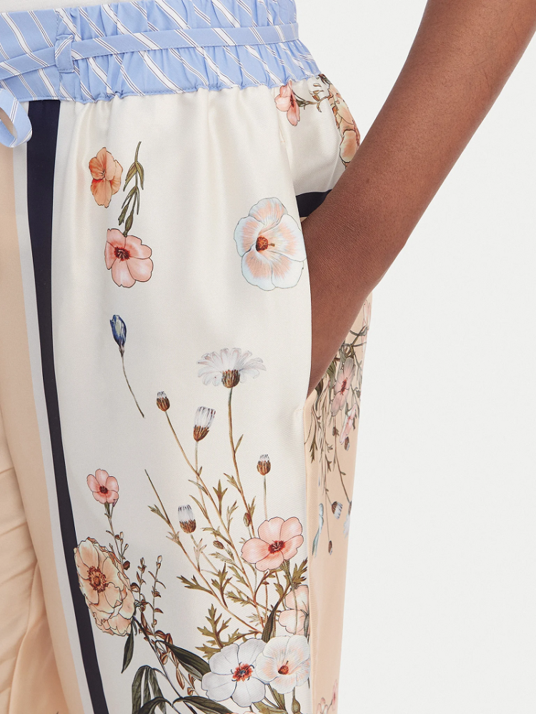 Štýlové dámske nohavice so širokými nohavicami a jemnou kvetinovou potlačou prinášajú dokonalú kombináciu pohodlia a elegancie. Ľahký, splývavý materiál zabezpečuje príjemné nosenie, zatiaľ čo elastický pás s viazaním sa prispôsobí postave a zvýrazní siluetu. Vertikálne pruhy opticky predlžujú nohy a dodávajú modelu moderný vzhľad. Ideálne na bežné nosenie, do práce aj na dovolenkové outfity. Skvelo sa kombinujú s jednoduchým topom, košeľou alebo sakom.