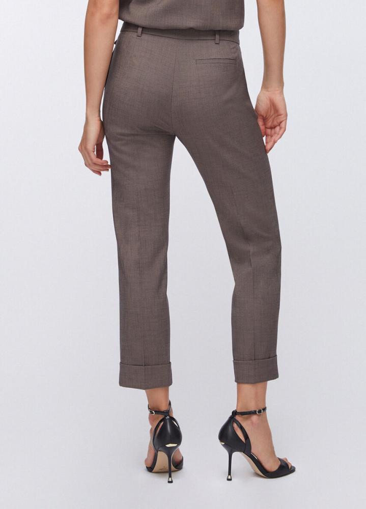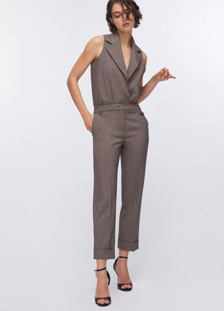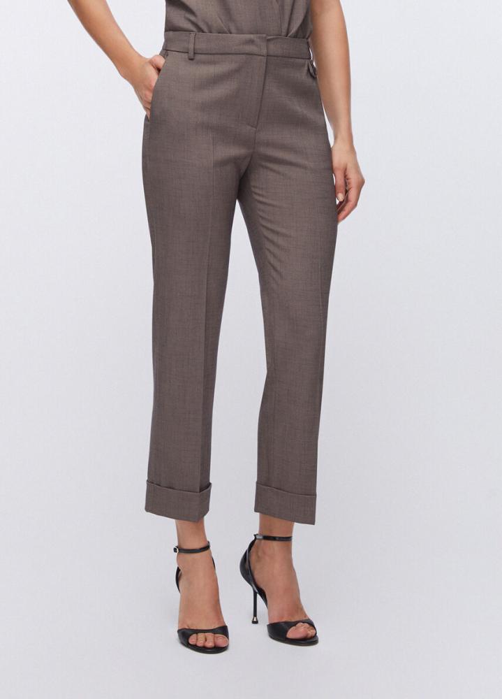 Vyšší pás s pútkami na opasok pôsobí veľmi žensky a umožňuje jednoduché kombinovanie s košeľou či sakom. Praktické bočné vrecká dodávajú nohaviciam funkčnosť, zatiaľ čo ohrnuté spodné lemy im dodávajú moderný a štýlový vzhľad.