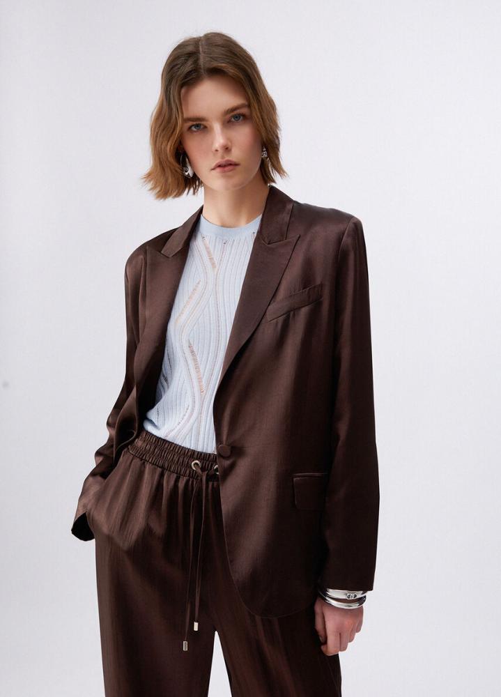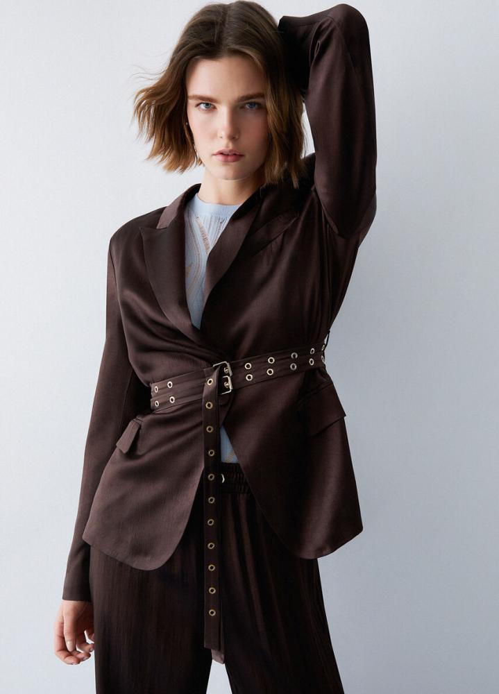 Moderné dámske sako, ktoré zaujme svojím luxusným saténovým vzhľadom a výrazným opaskom s kovovými detailmi. Tento model dokonale kombinuje eleganciu s odvážnym módnym prvkom, vďaka čomu vytvoríte nezabudnuteľný outfit.