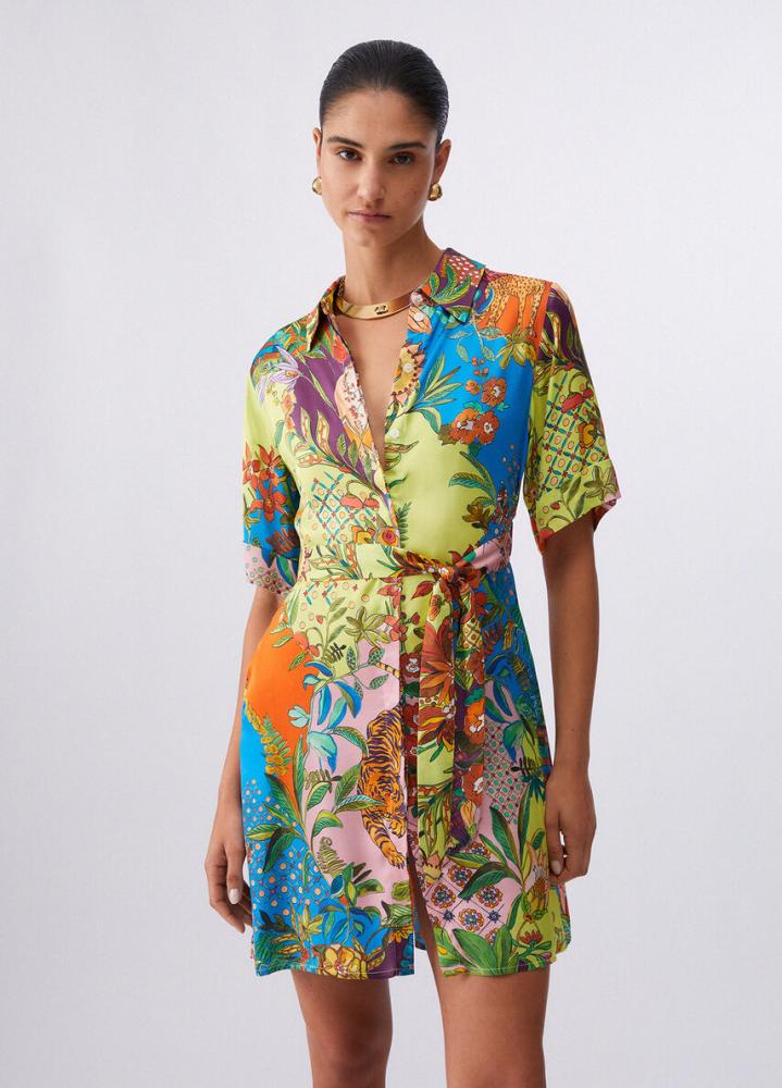 Košeľový strih s golierom a zapínaním na gombíky pôsobí elegantne, zatiaľ čo viazanie v páse krásne zvýrazní siluetu. Krátke rukávy a ľahký materiál zaručujú pohodlie aj počas teplejších dní.