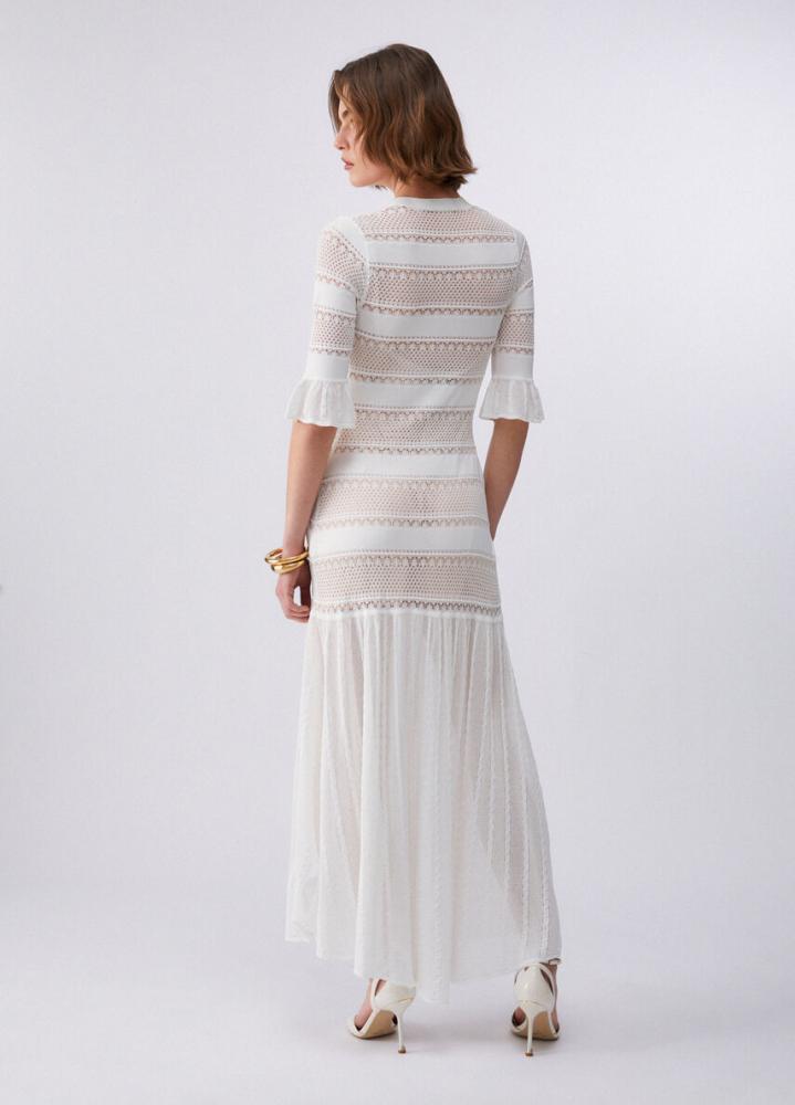 Tento model zaujme detailnou štruktúrou čipkovaných panelov, ktoré sa vodorovne striedajú po celej dĺžke hornej časti, elegantnými trojštvrťovými rukávmi s jemným volánikom a predným zapínaním na drobné perleťové gombíky, ktoré vizuálne predlžuje siluetu. Šaty plynule prechádzajú do dlhej, padavej sukne s miernym riasením na spodnom okraji, čo pri pohybe vytvára krásny a ladný efekt. Výstrih do V jemne odhaľuje dekolt a krk.
