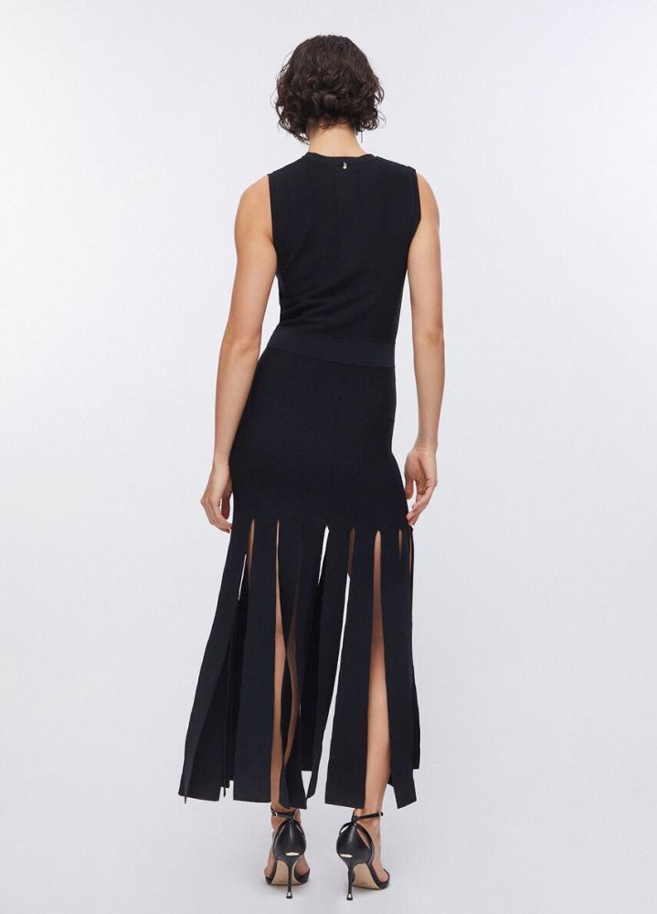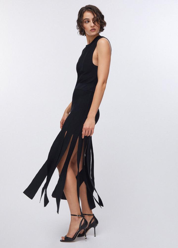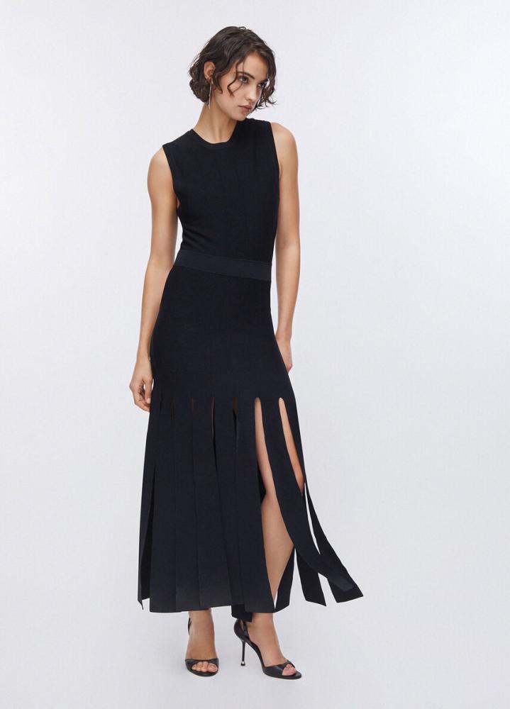 Hľadáte kúsok, ktorý definuje modernú eleganciu? Tieto úpletové šaty v hlbokej čiernej farbe sú stvorené pre ženu, ktorá sa nebojí vyčnievať z davu. Dominantným prvkom je unikátna lamelová sukňa, ktorá v spodnej časti odhaľuje nohy prostredníctvom odvážnych vysokých rozparkov. Pri každom kroku vytvárajú šaty fascinujúci pohyb, ktorý dodáva celému outfitu dynamiku a dramatickosť.