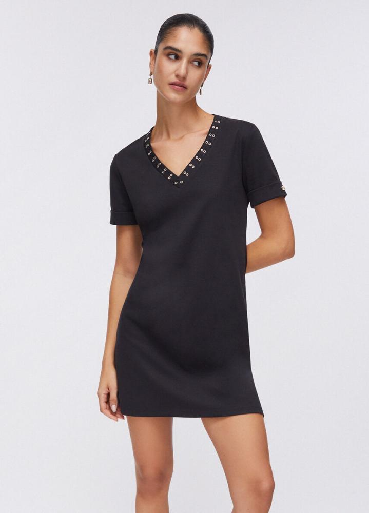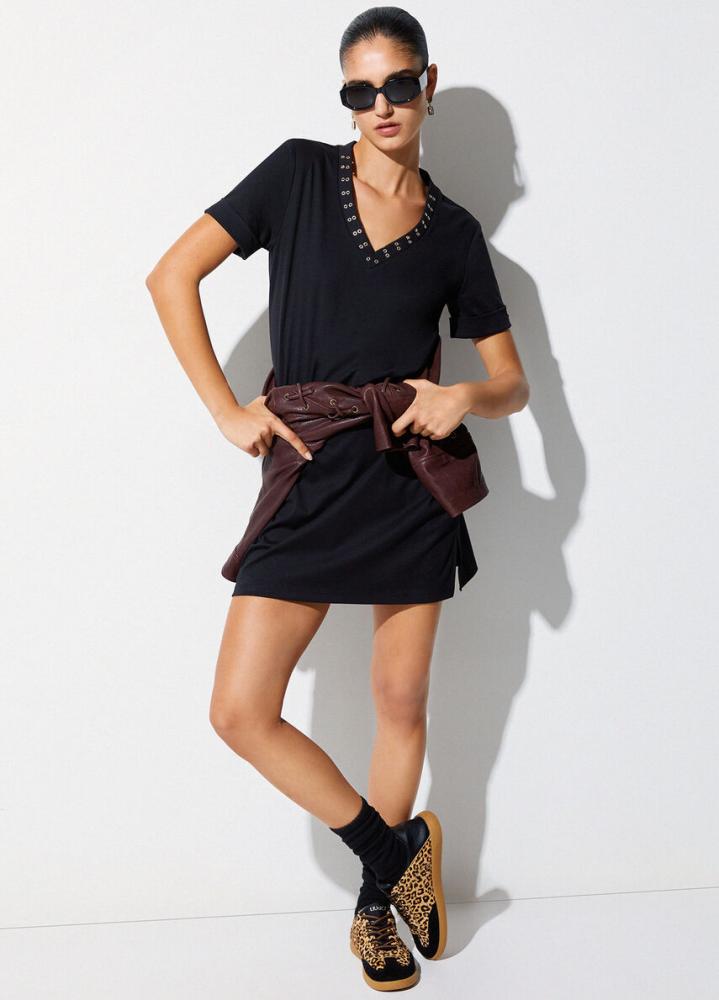 Elegantné čierne šaty s kovovými detailmi.