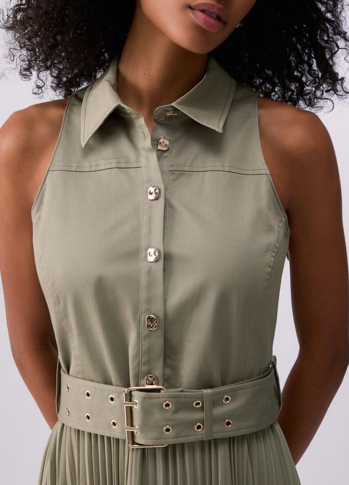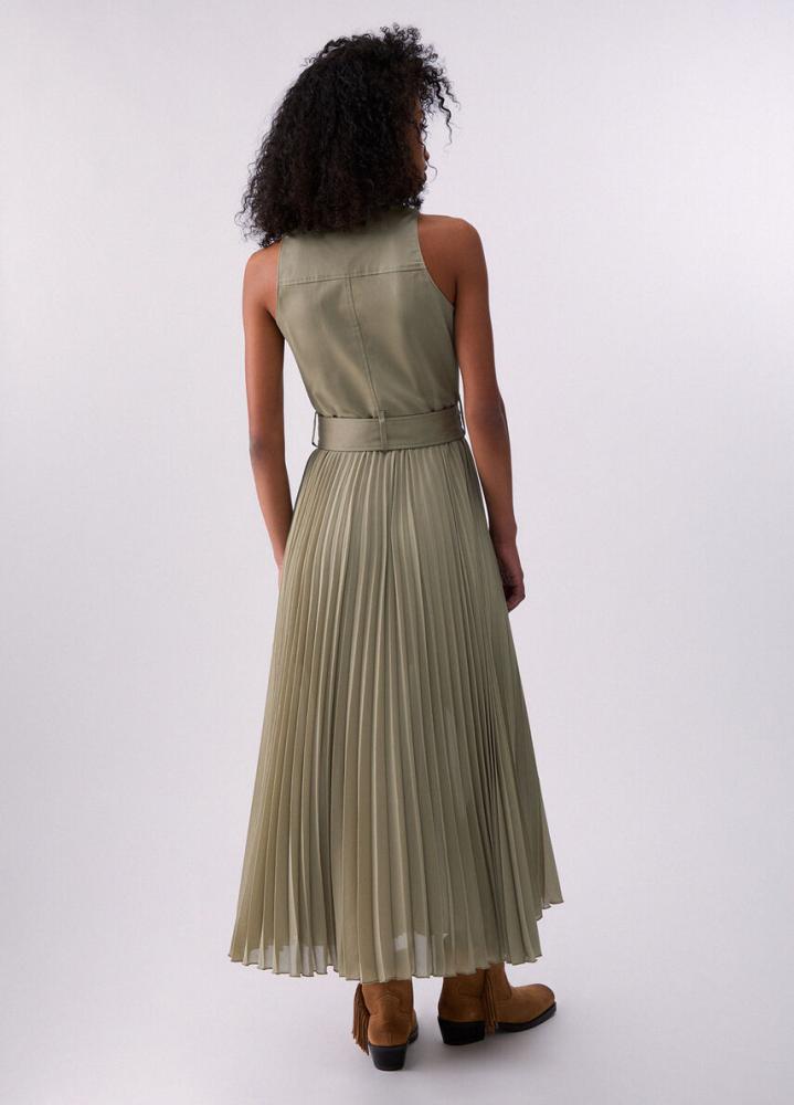 Tieto skladané midi šaty sa pohrávajú s rovnováhou medzi štruktúrou a pohybom: štruktúrovaný korzet s golierom interaguje s plynulým strihom sukne a vytvára kontrast, ktorý rezonuje s každým krokom.