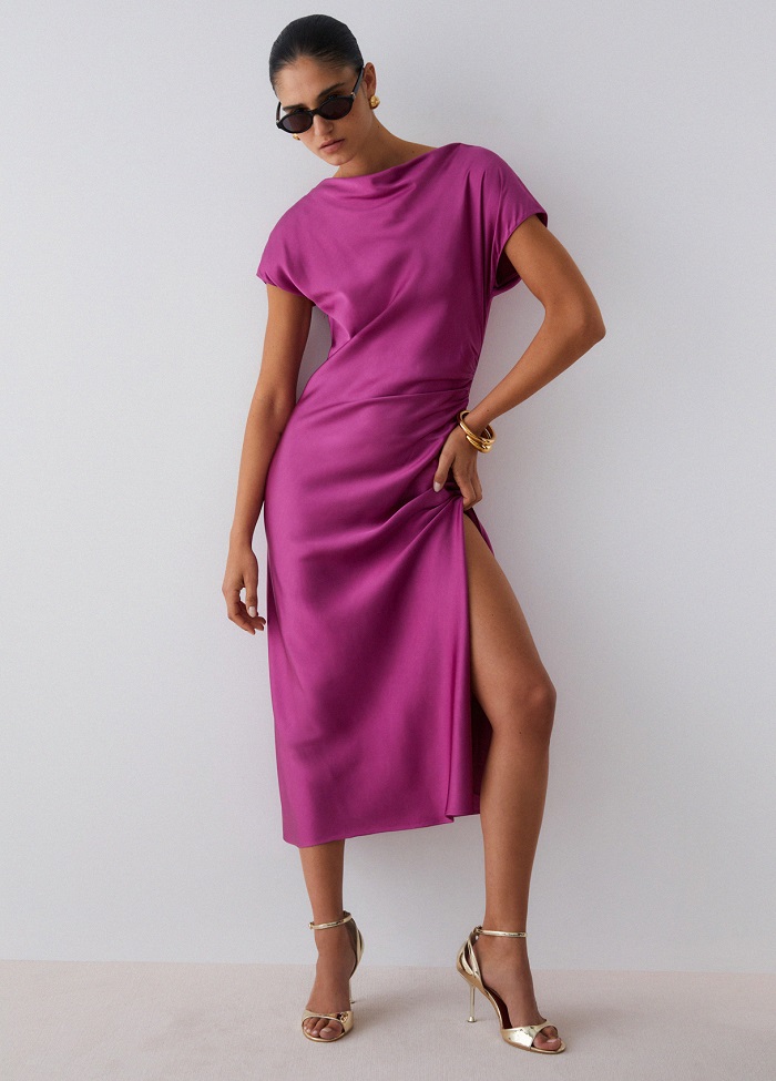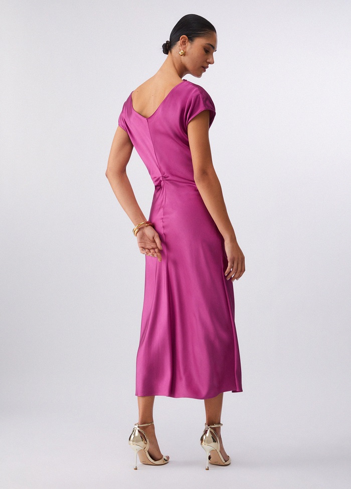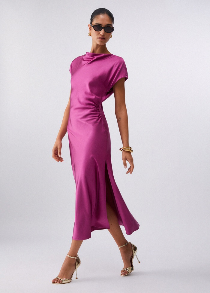 Tieto šaty sú stelesnením modernej elegancie a rafinovanosti. Ich podmanivá jasne ružová farba v kombinácii s jemným odleskom saténu z vás urobí hviezdu každého večierka, svadby či letnej oslavy. Splývavý saténový materiál sa príjemne nosí a pôsobí mimoriadne exkluzívne. Midi dĺžka je nadčasová a hodí sa k vysokým podpätkom aj elegantným sandálom.