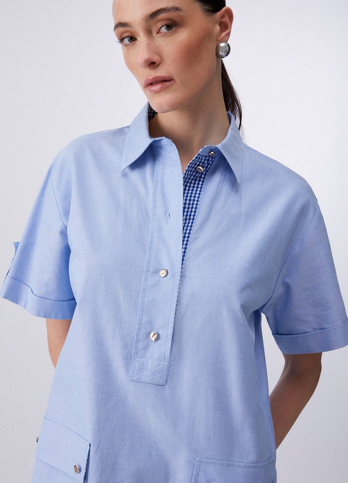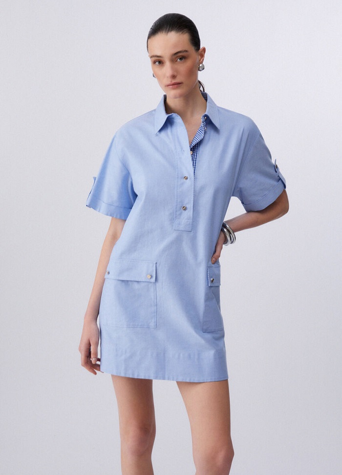 Tieto bledomodré košeľové šaty sú stelesnením nenútenej elegancie a letnej sviežosti. Vďaka premysleným detailom a nadčasovému strihu sa stanú vaším obľúbeným kúskom na bežný deň v meste aj na víkendovú kávu na terase. Skvele ladia s bielymi teniskami pre športový look, ale aj s minimalistickými sandálmi na podpätku.