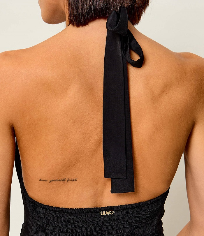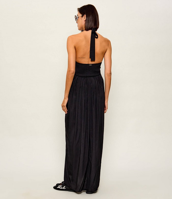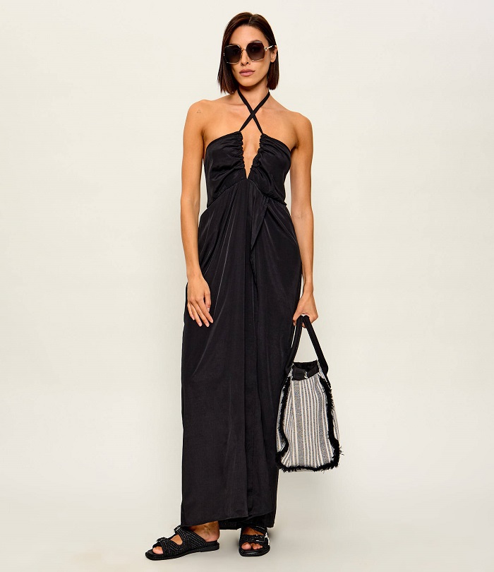 Elegantné, nadčasové a zároveň výrazne ženské – tieto dlhé čierne šaty sú ideálnou voľbou na letné dni aj večerné príležitosti. Jemne splývavý materiál krásne kopíruje postavu a zabezpečuje maximálne pohodlie počas nosenia. Dominantným prvkom je efektné viazanie okolo krku, ktoré vytvára zaujímavý výstrih a pôsobí veľmi sofistikovane.