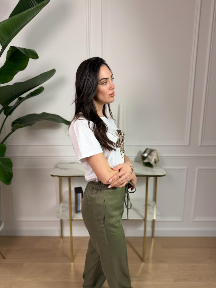 Dominantou modelu je nádherná predná aplikácia v tvare včielky. Tá je precízne vyskladaná z trblietavých kamienkov v elegantných zlatých a hnedých tónoch, ktoré na čistom bielom podklade krásne vyniknú a hádžu jemné odlesky pri každom pohybe. Tričko má pohodlný klasický strih (Regular Fit), vďaka čomu sa skvele nosí a ľahko kombinuje. Je vyrobené z kvalitnej bavlny, ktorá je príjemná na dotyk a priedušná.