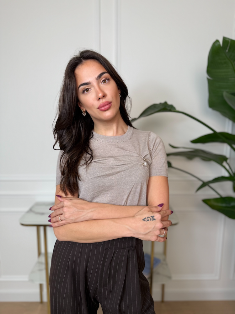 LIU JO – KAŠMÍROVÝ TOP S KRÁTKYM RUKÁVOM A PERLOVOU SPONOU