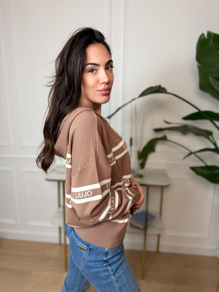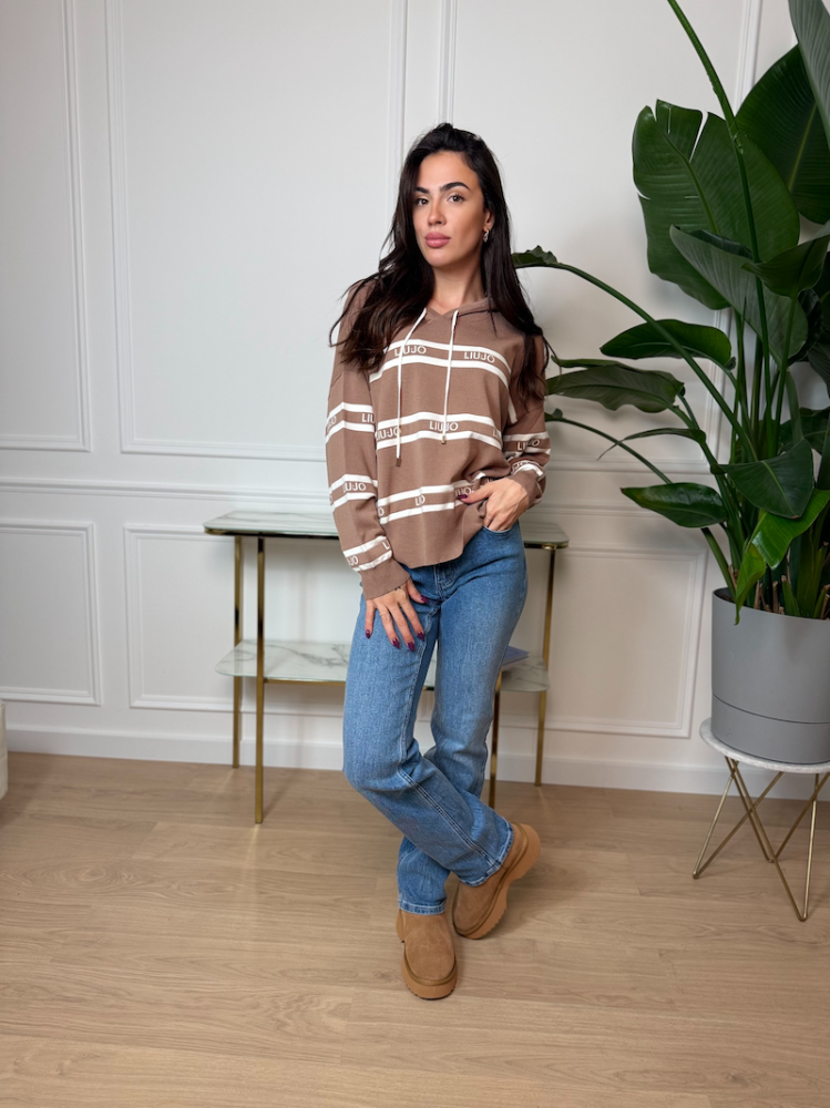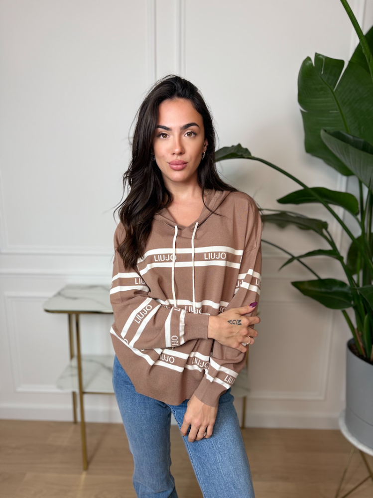 LIU JO – SVETROVÁ MIKINA S PÁSIKMI A KAPUCŇOU (HNEDO-BIELA)