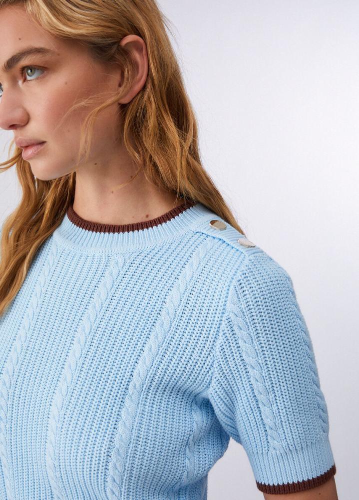 Pletený sveter Liu Jo v modrej farbe Ozdobné gombíky na ramene Kontrastné hnedé lemovanie