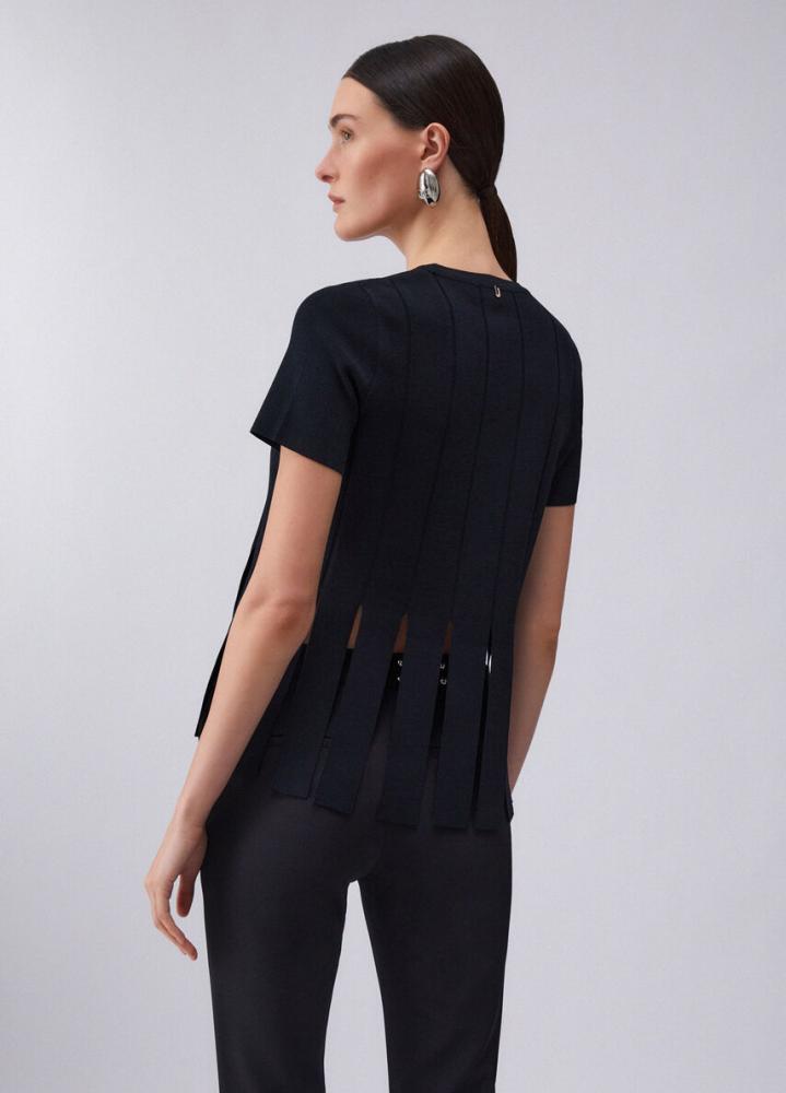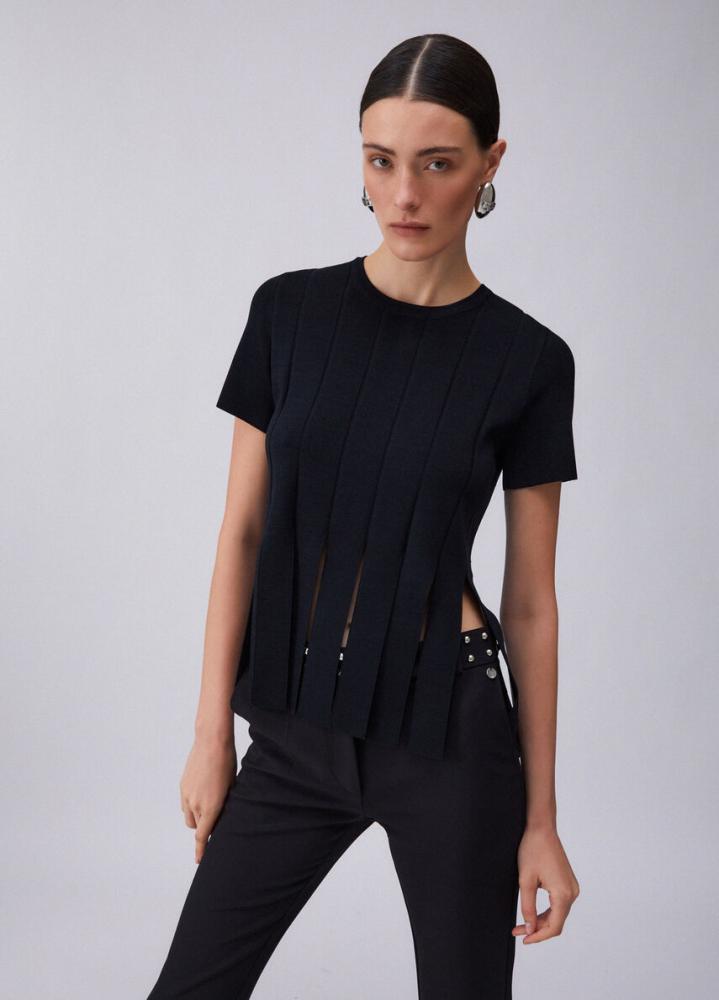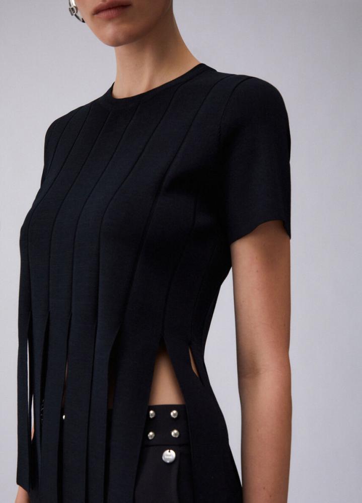 Posuňte svoj každodenný outfit na novú úroveň s týmto čiernym topom. Čierny úpletový model s krátkym rukávom vsádza na hru línií a geometrie. Vertikálne členenie prechádza v spodnej časti do voľných lamiel, ktoré vytvárajú rafinované prestrihy a dodávajú topu nečakaný pohyb a ľahkosť.