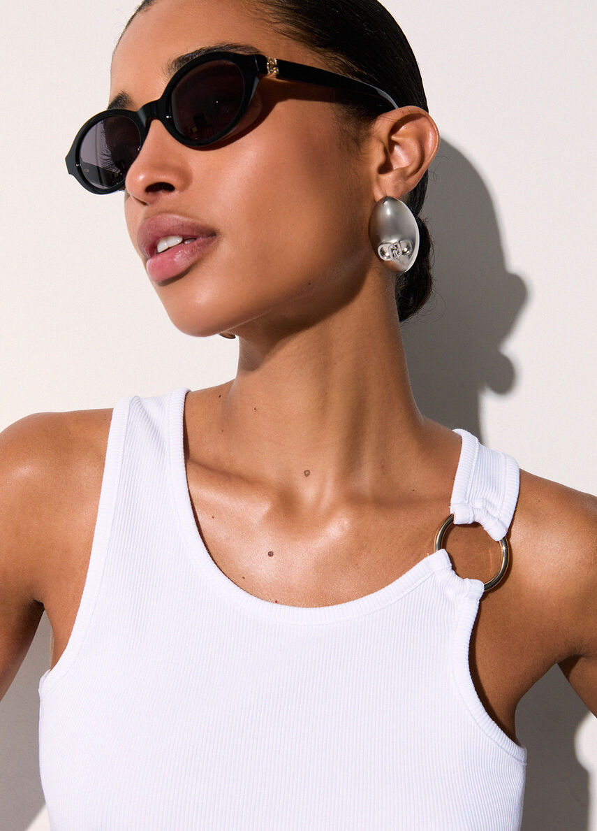 Prečo si ho zamilujete? Asymetrický detail: Zlatý (alebo strieborný, podľa verzie) kovový krúžok na ramienku dodáva topu punc exkluzivity a nahrádza šperk.