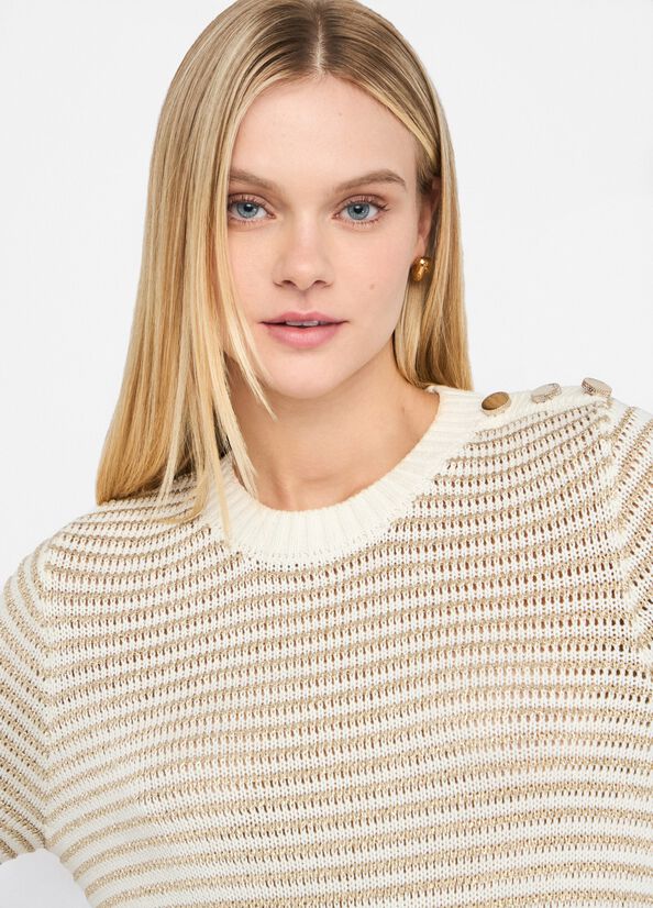 Pruhovaný sveter v krémovo-béžovej farbe Ležérny, no zároveň ženský sveter, ktorý dodá každému outfitu sviežosť a štýl. Jemná pruhovaná štruktúra a pohodlný pletený materiál zaručujú príjemný pocit pri nosení. Okrúhly výstrih a zapínanie na ramene s ozdobnými gombíkmi pôsobia elegantne a moderne zároveň. Ideálny kúsok na prechodné obdobie — výborne sa kombinuje s džínsami, sukňou či elegantnými nohavicami.