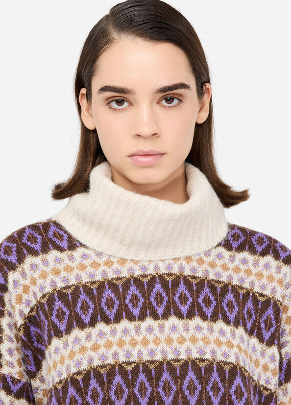 Mäkký a hrejivý sveter s rolákom, ktorý zaujme originálnym geometrickým vzorom v odtieňoch fialovej, béžovej a krémovej. Voľnejší strih a spustené ramená dodávajú ležérny, no elegantný vzhľad. Ideálny k džínsom aj elegantným nohaviciam – perfektný kúsok na chladné dni.