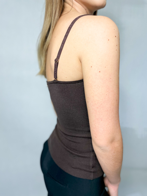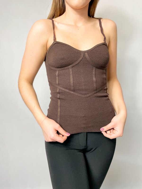 LIU JO Strečový top na ramienka hnedej farby. Detaily s korzetovým efektom. Odnímateľné tenké ramienka s logom. Ceny sú uvedené vrátane DPH. Dostupné veľkosti uvedené v možnostiach košíka.