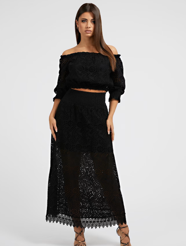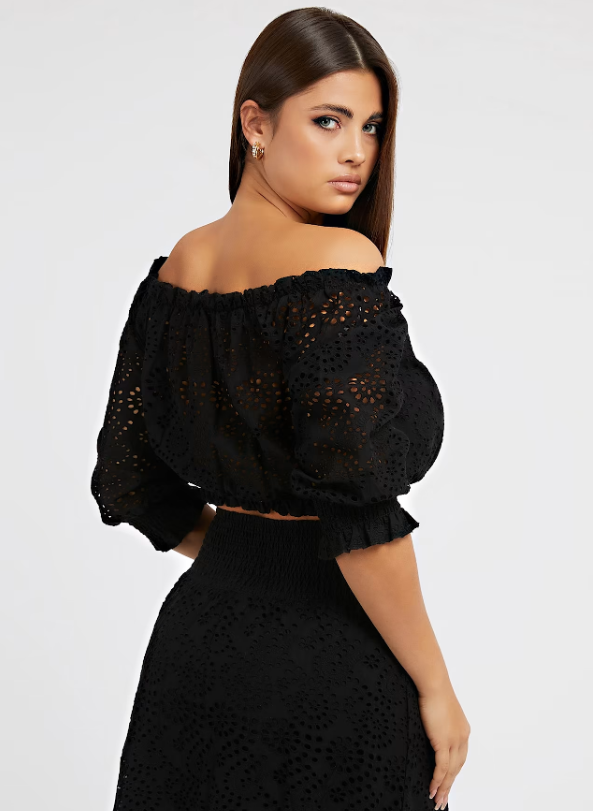 Čierny madeirový crop top Guess s dlhým rukávom. Voľný top s padnutými ramenami. Kombinujte k sukni alebo nohaviciam s vysokým pásom.