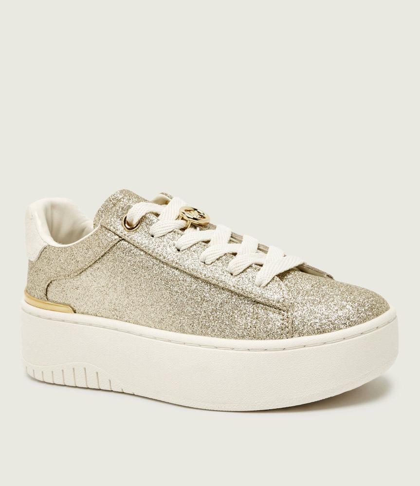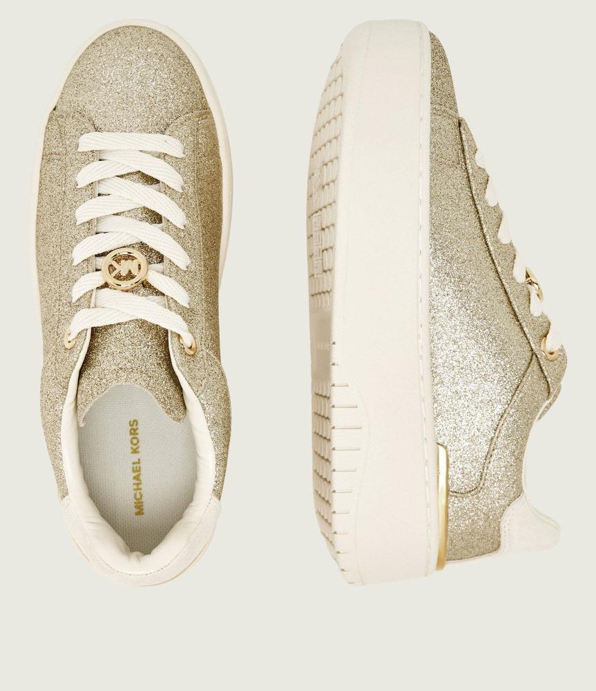 Tieto elegantné tenisky v zlatom prevedení sú dokonalým spojením pohodlia a moderného glamour štýlu. Jemne trblietavý povrch dodáva outfitu luxusný nádych, zatiaľ čo čistá biela podrážka zabezpečuje nadčasový a ľahko kombinovateľný vzhľad.