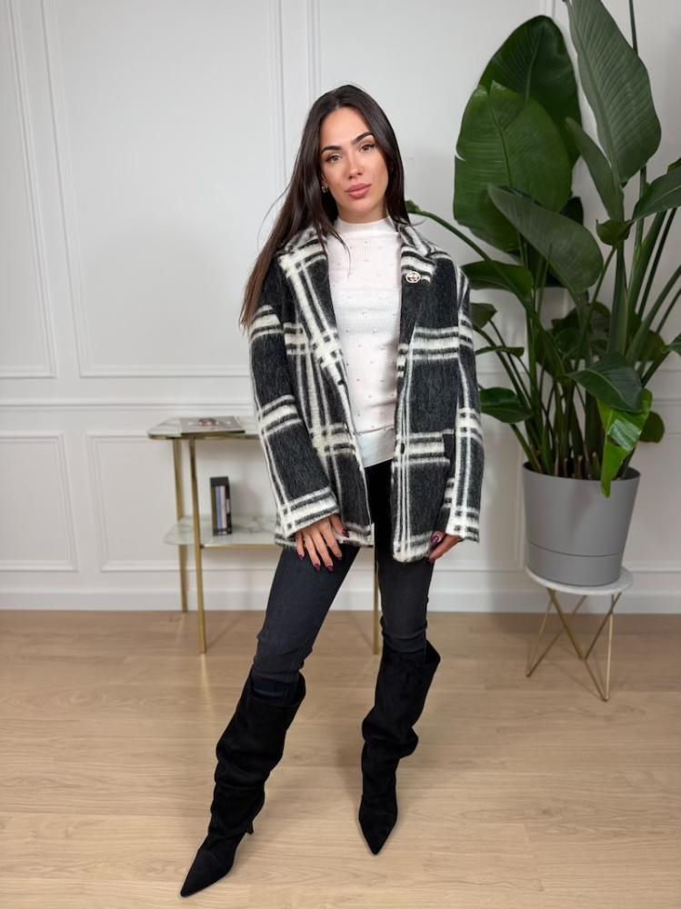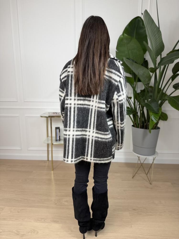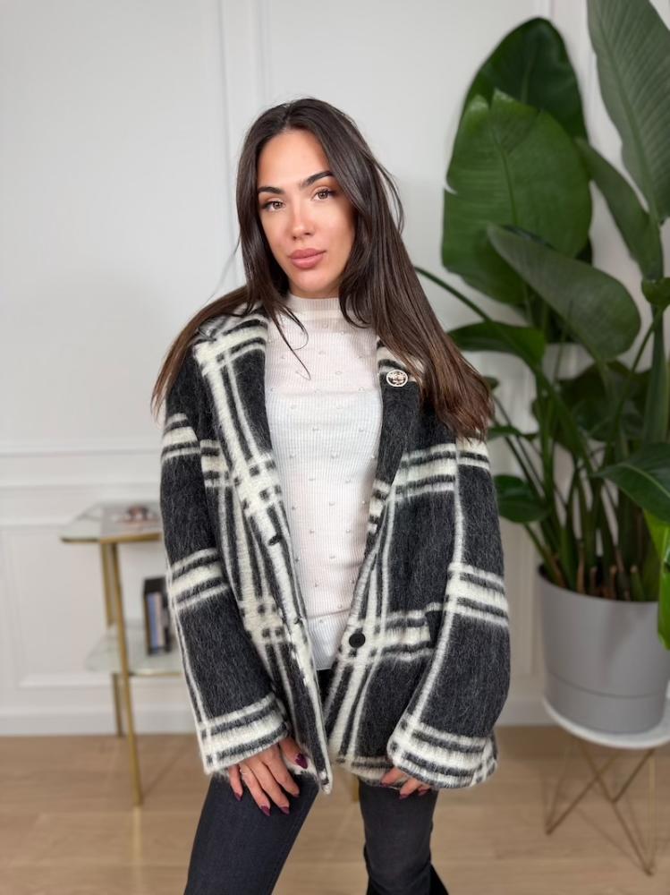 Dámske trendy zaujímavé oversize sako. Teplé podšité kabátové prevedenie. Zaujímavý dizajn v kombinácii sivej bielej a čiernej farby.