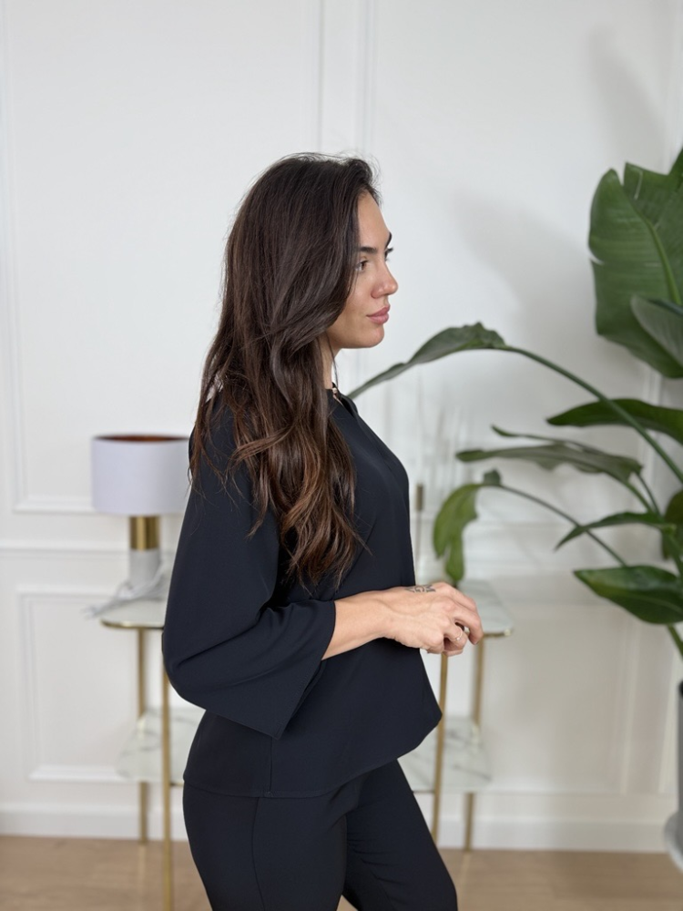 Voľný strih so širokými rukávmi poskytuje komfort a voľnosť pohybu, zatiaľ čo decentný rozparok s kovovým detailom pri výstrihu dodáva topu sofistikovaný nádych.