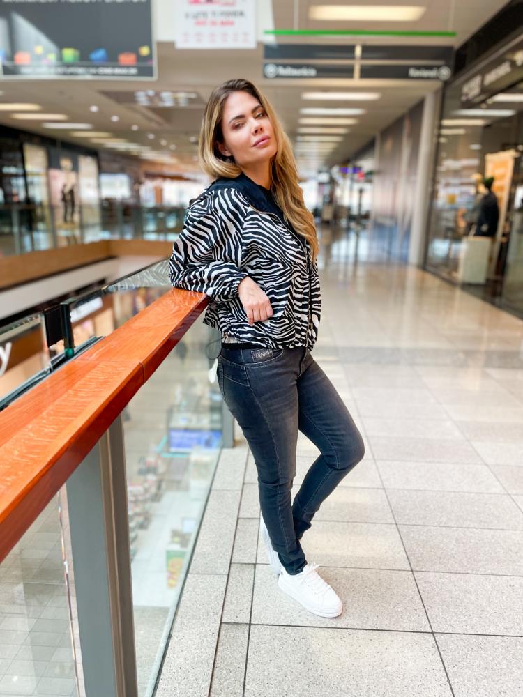 Obojstranná bunda Liu Jo . Bunda má z jednej strany potlač zebrového vzoru a z druhej strany je čierna . Bunda má z oboch strán vrecká po bokoch . Zapínanie bundy je na zips . Bunda je oversize strihu . Spodok bundy sa dá stiahnuť na 2 patenty gumičkou. Detaily sú v striebornej farbe .