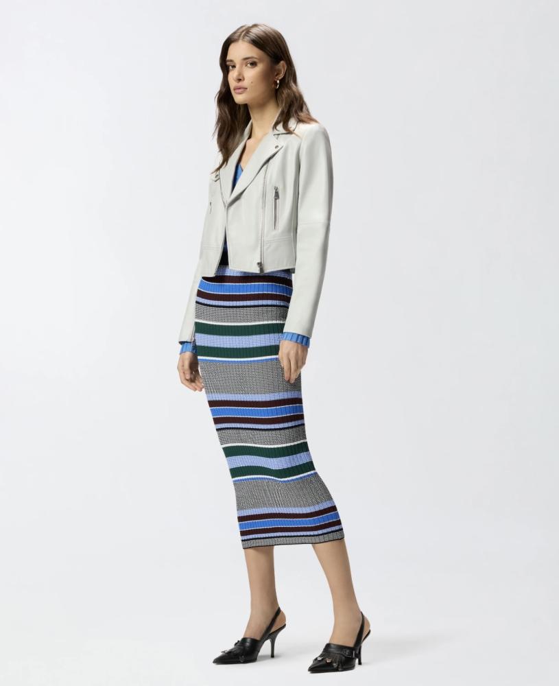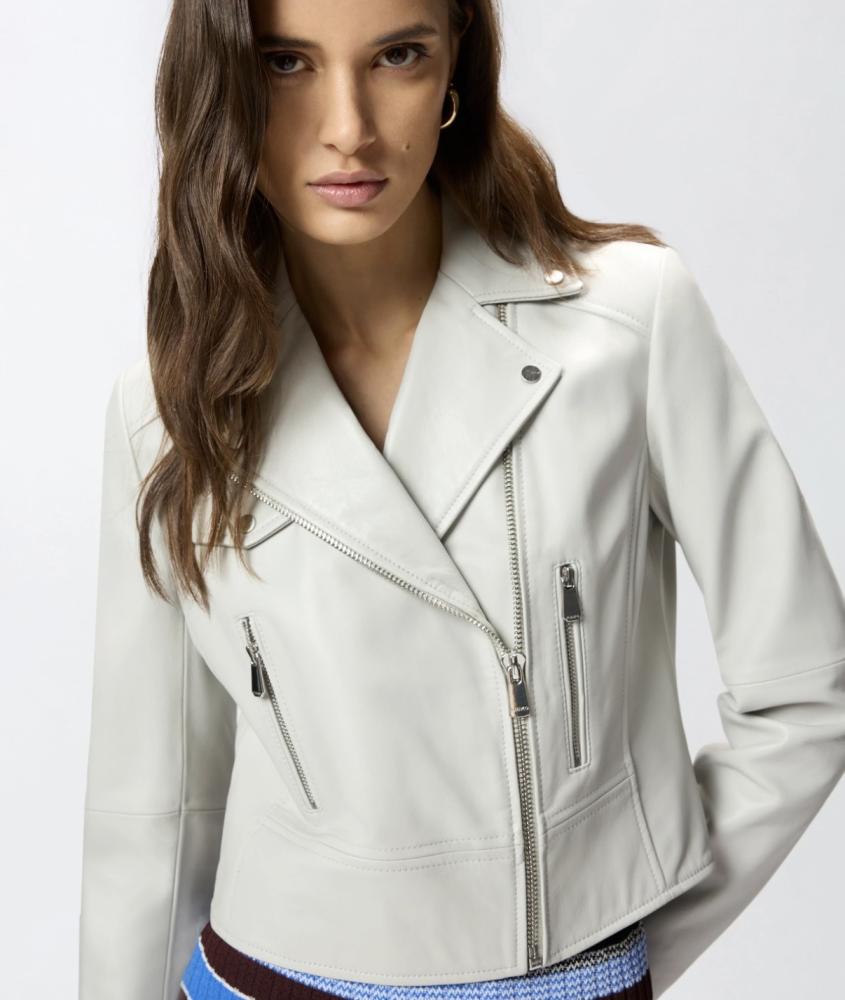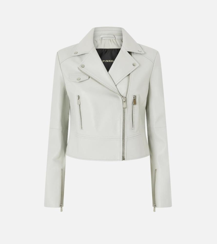 Osviežujúca elegancia s rebelským srdcom, ktorá rozžiari váš šatník. Táto úchvatná kožená bunda v "biker" štýle od značky PINKO v nádhernom svetlom (smotanovom či svetlosivom) odtieni je dokonalou a mimoriadne šik alternatívou ku klasickej čiernej.