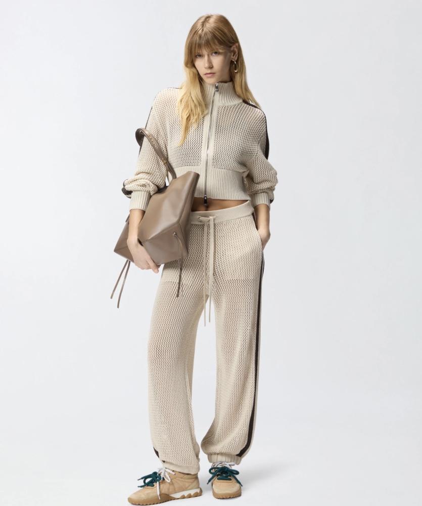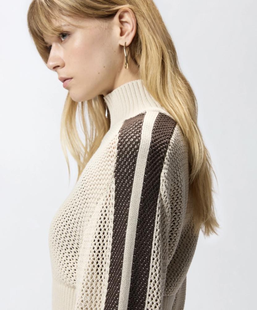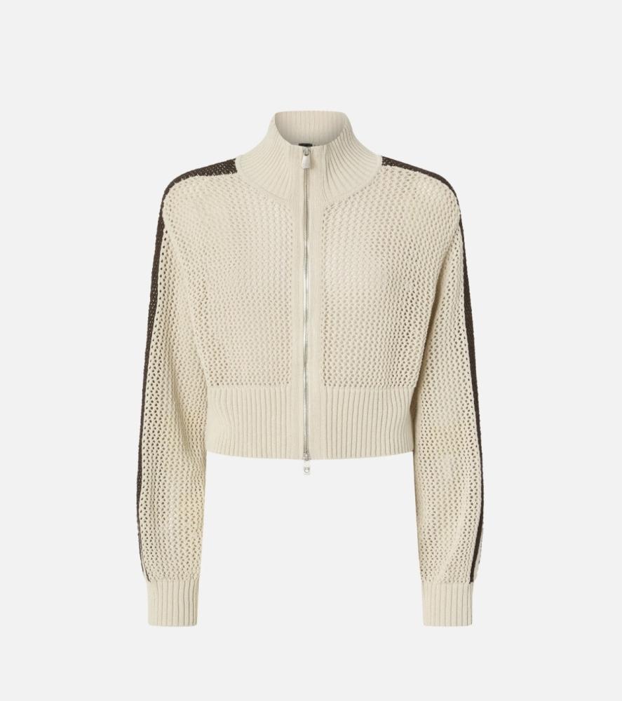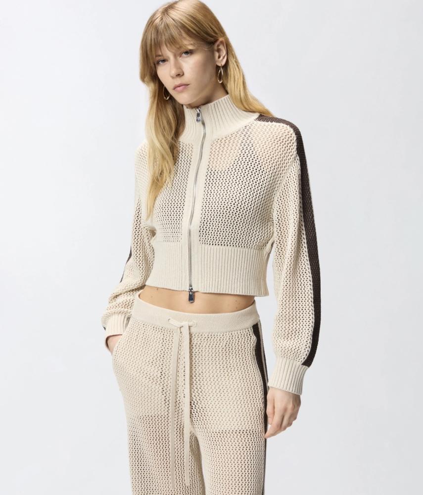 Model si vás získa na prvý pohľad svojou jedinečnou textúrou. Vzdušný, perforovaný úplet nielenže vyzerá neuveriteľne chic, ale zaručuje aj výbornú priedušnosť počas prechodných či letných dní. Mikina má mimoriadne lichotivý, skrátený "cropped" strih, ktorý nádherne formuje siluetu a ideálne sa hodí k nohaviciam či sukniam s vysokým pásom. Dizajn je dotiahnutý k dokonalosti vďaka elegantnému vysokému stojanovému golieru, poctivému kovovému zipsu a širokým rebrovaným lemom na páse a rukávoch. Športový, no pritom veľmi sofistikovaný akcent jej dodáva výrazný tmavohnedý pruh tiahnuci sa pozdĺž celých ramien a rukávov.