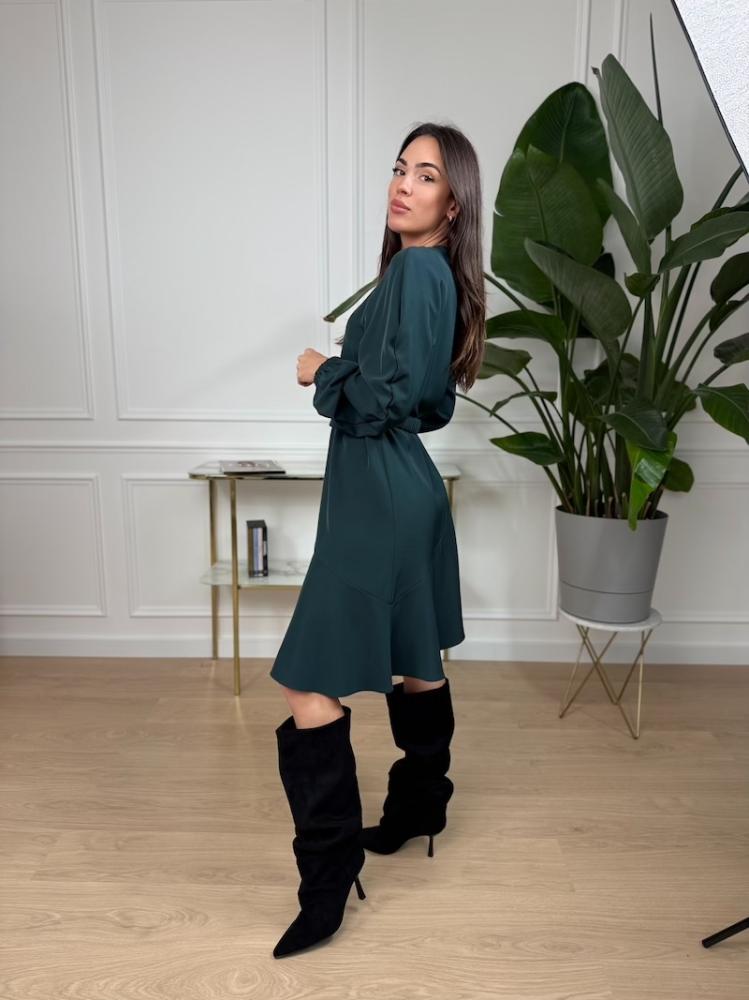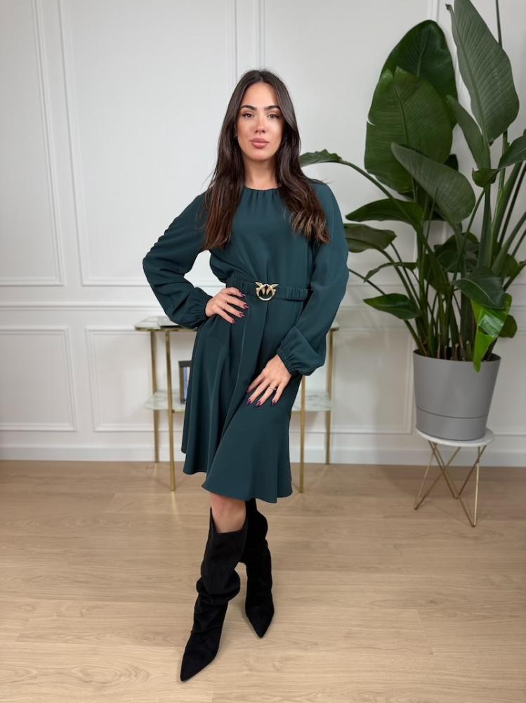 Dámske Pinko tmavo zelené šaty vo vľnom padavom strihu s dlhým rukávom. Opasok s logom súčasťou.