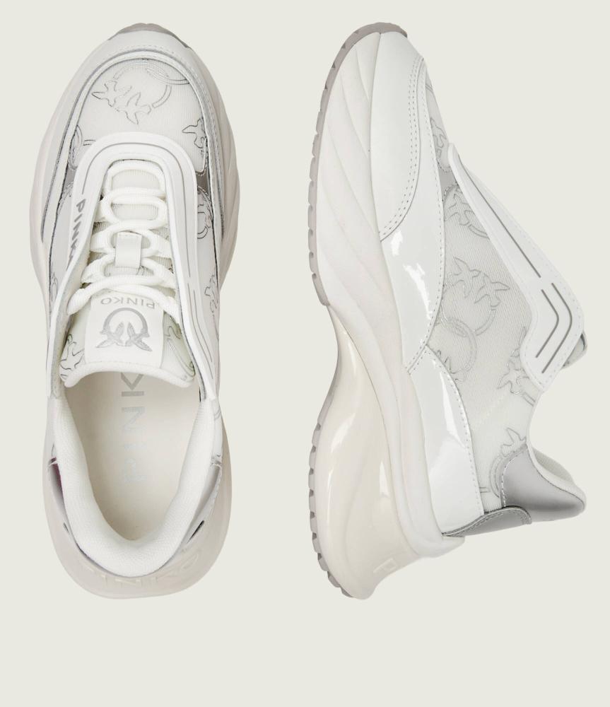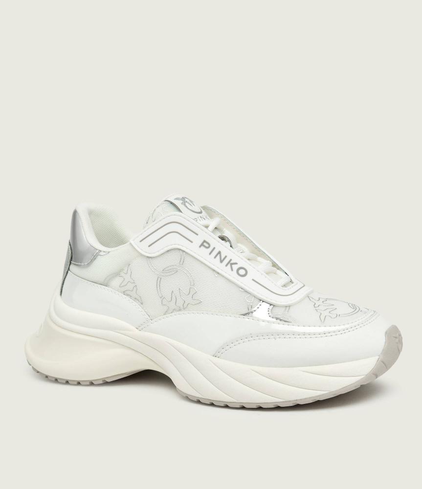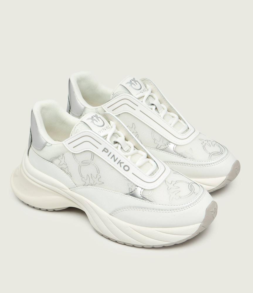 Model si vás okamžite získa svojou trendovou, dynamicky tvarovanou masívnou podrážkou, ktorá nielenže opticky predĺži nohy, ale zaručí aj bezkonkurenčný komfort počas celého dňa. Čistý biely zvršok z prepracovanej kombinácie materiálov je rafinovane oživený metalickými striebornými detailmi, jemným vzorom ikonických Love Birds a výrazným logom PINKO na bočnej strane.