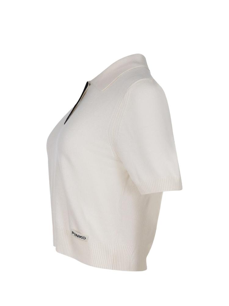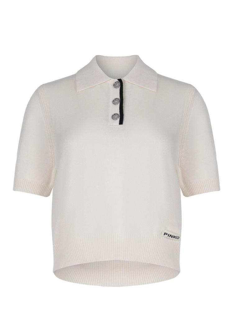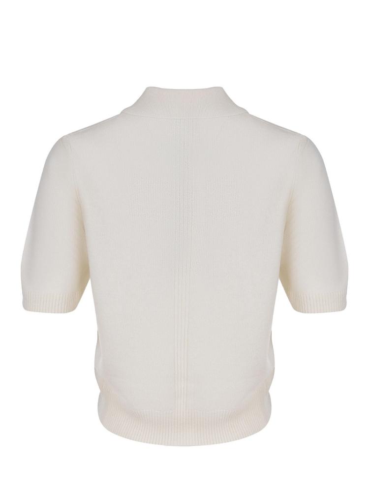 Elegantný pletený top v štýle polo je nadčasovým kúskom, ktorý spája komfort a sofistikovaný dizajn. Jemný úplet v krémovo-bielej farbe pôsobí čisto a luxusne, zatiaľ čo golier so zapínaním na ozdobné gombíky dodáva modelu šmrnc a ženskosť. Krátke rukávy a mierne skrátený strih robia z tohto topu ideálnu voľbu k nohaviciam s vysokým pásom, sukniam či džínsom. Minimalistický detail s logom na spodnom leme podčiarkuje exkluzívny charakter kúsku.