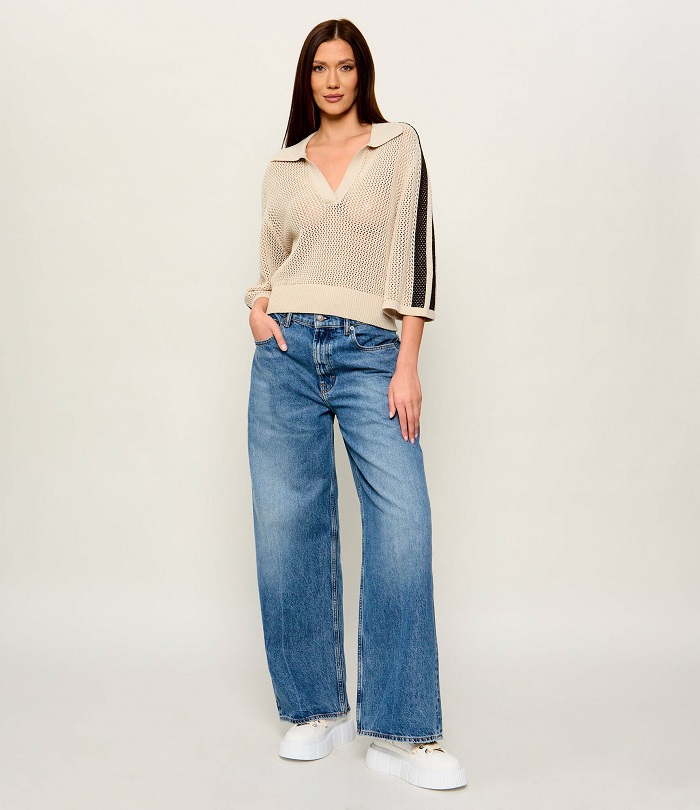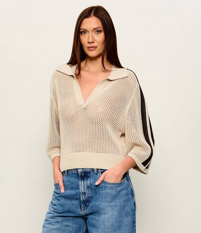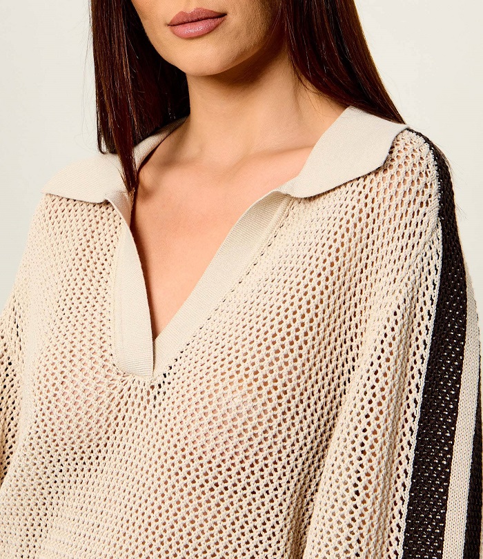 Tento sveter je dokonalým spojením ležérneho pohodlia a moderného mestského štýlu. Vďaka svojmu unikátnemu dierkovanému úpletu a prepracovaným detailom sa stane vaším obľúbeným kúskom na prechodné obdobie. Moderný véčkový výstrih doplnený o elegantný polo golier dodáva svetru športovo-elegantný nádych. Tento sveter je neuveriteľne variabilný. Pre uvoľnený denný look ho skombinujete s obľúbenými džínsami s vysokým pásom.