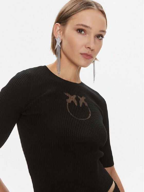 Štýlové čierne tričko, ktoré spája jednoduchosť a eleganciu. Vyrobené z jemne elastického rebrovaného úpletu, perfektne sa prispôsobí postave a zvýrazní ženské krivky. Tričko má priliehavý strih, krátke rukávy po lakte a klasický okrúhly výstrih. Na prednej strane je decentné priesvitné logo, ktoré dodáva modelu moderný a originálny vzhľad. Ideálne na bežné nosenie aj na večerné kombinácie – vyzerá skvelo s džínsami, koženou sukňou či elegantnými nohavicami.