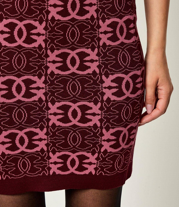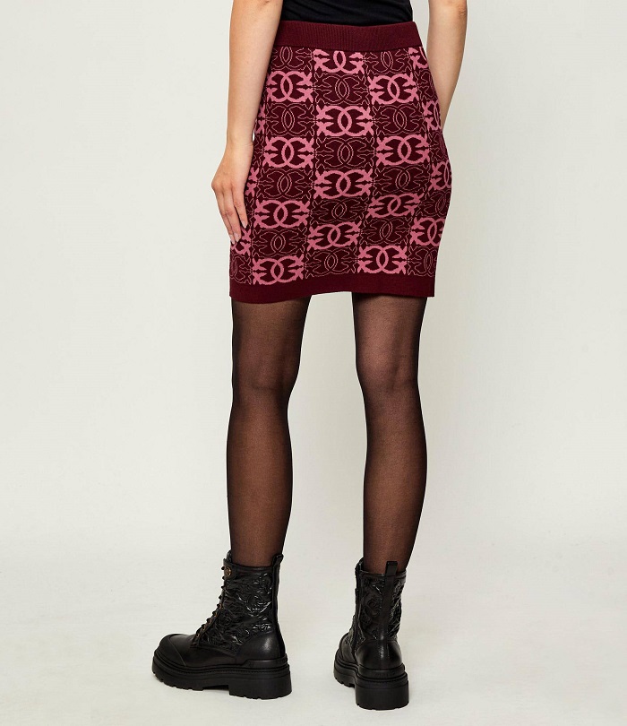 Moderná dámska sukňa v kombinácii vínovej a ružovej farby s výrazným celoplošným vzorom. Je ušitá z príjemného elastického úpletu, ktorý sa dokonale prispôsobí postave a zvýrazní ženské krivky. Má pohodlný elastický pás a krátky, rovný strih. Skvelo sa hodí k zladenému svetru pre efekt súpravy alebo k jednoduchému jednofarebnému topu.
