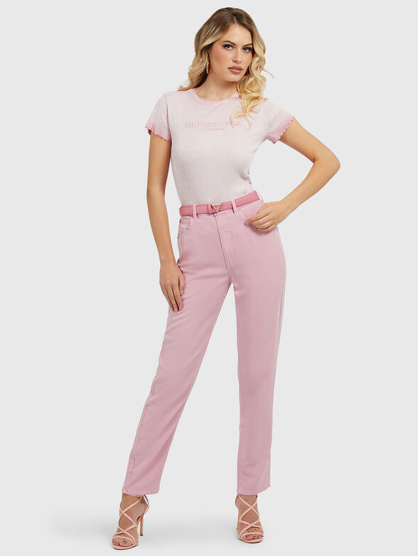 Ružové bavlnené tričko Guess s vyblednutým efektom. Predný nápis Guess. Tričko s krátkym rukávom, úzky strih.