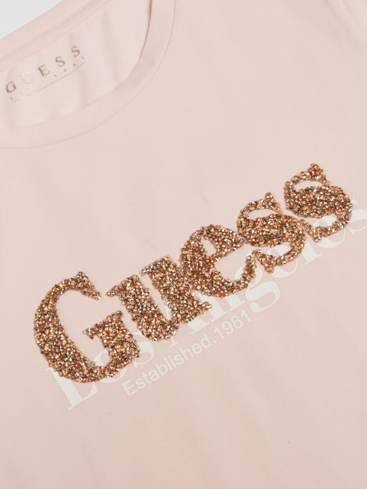 Ružové tričko Guess s nápisom na prednej strane v prevedení s kamienkov. Tričko s krátkym rukávom a okrúhlym výstrihom. Slim fit strih.