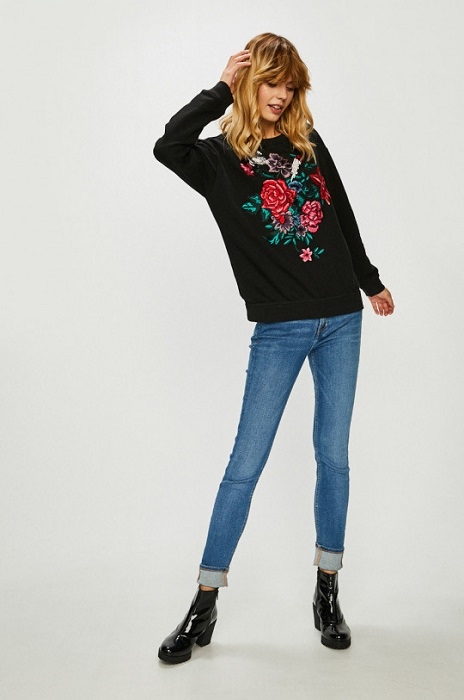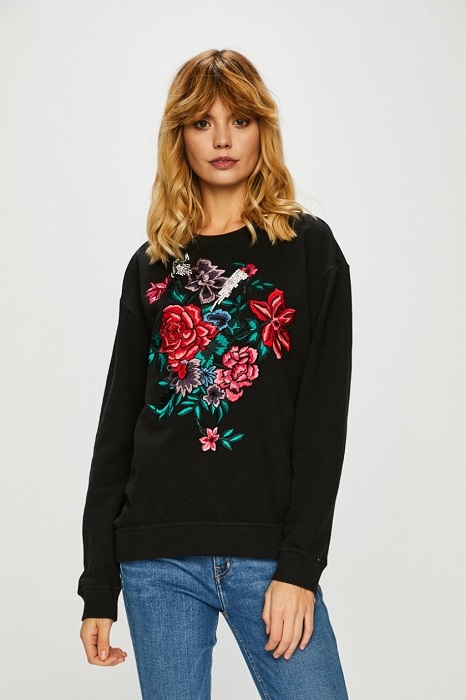 PREVEDENIE: Silvian Heach dámska čierna mikina s potlačou na prednej strane. Na prednej strane vyšívaná kvetová potlač, so štrasovými kamienkami . Mikina s dlhým rukávom so zakončením na patent. Mikina s výstrihom do U a miernym oversize strihom.