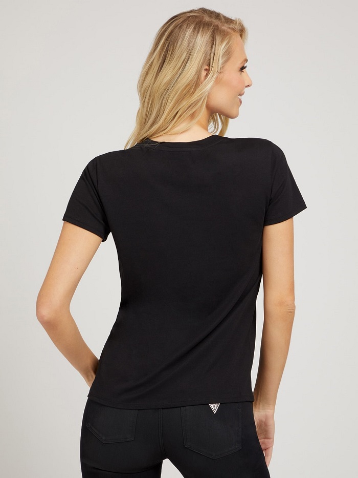 Čierne tričko Guess s potlačou na prednej strane. Tričko s krátkym rukávom a okrúhlym výstrihom, mierne širší strih s dĺžkou do pása.