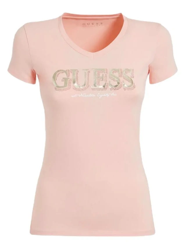 Tričko s nápisom Guess na prednej strane v lesklom prevedení, s glitrami. Úzky strih trička do pásu, krátky rukáv a mierny V výstrih.