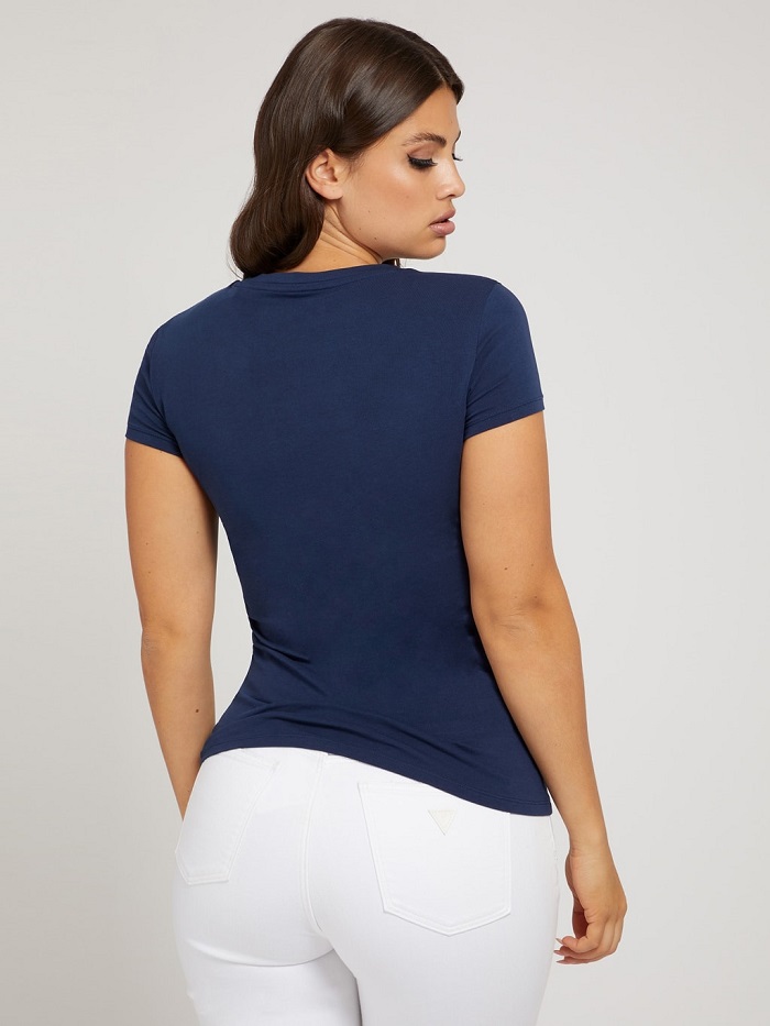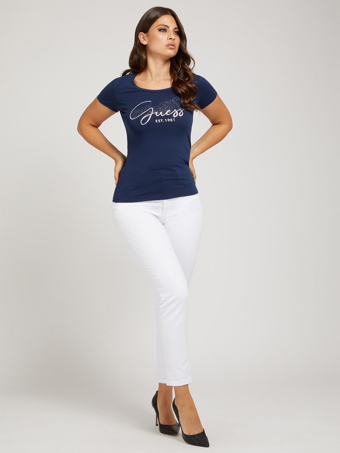 Modré tričko Guess s ozdobným nápisom na prednje strane. Tričko s krátkym rukávom a okúhlym výstrihom. Úzky strih a elastický materiál.