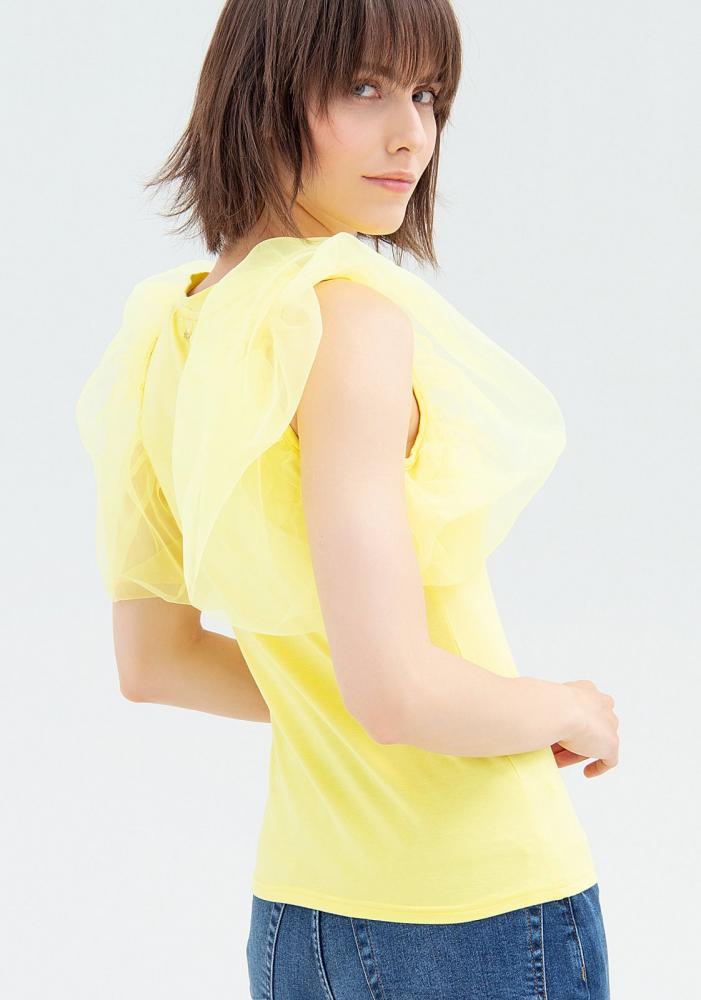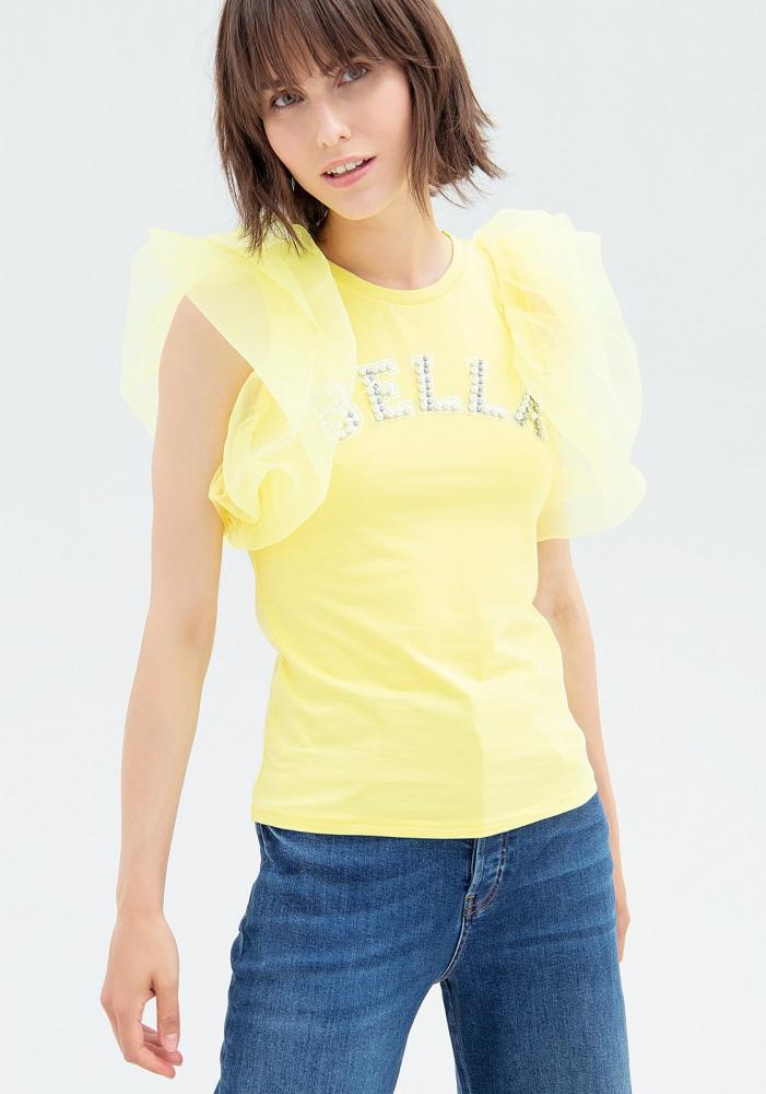 Žlté tričko Fracomina s tylovým rukávom. Okrúhly výstrih a rovný slim fit strih. Predná potlač s aplikáciou šperkov.
